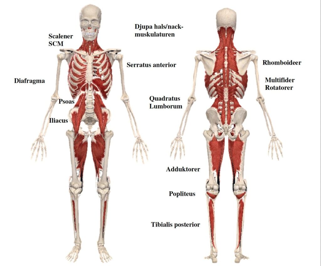 Den och våra övriga hållningsmuskler kan man stärka och aktivera med posturalterapi vilket sedan löser hela kedjan från fot till nacke.